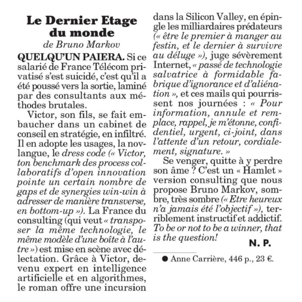 « Le roman offre une incursion dans la Silicon Valley, en épingle les milliardaires prédateurs. […] Terriblement instructif et addictif » N. P.